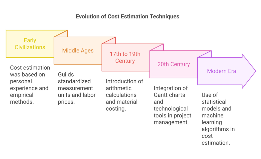 Early builders estimated through pure experience and rule of thumb. More formalized approaches emerged: analogous estimation (borrowing from comparable past projects), parametric estimation (building statistical relationships between variables and cost), and bottom-up estimation (pricing out every task in a work breakdown structure).